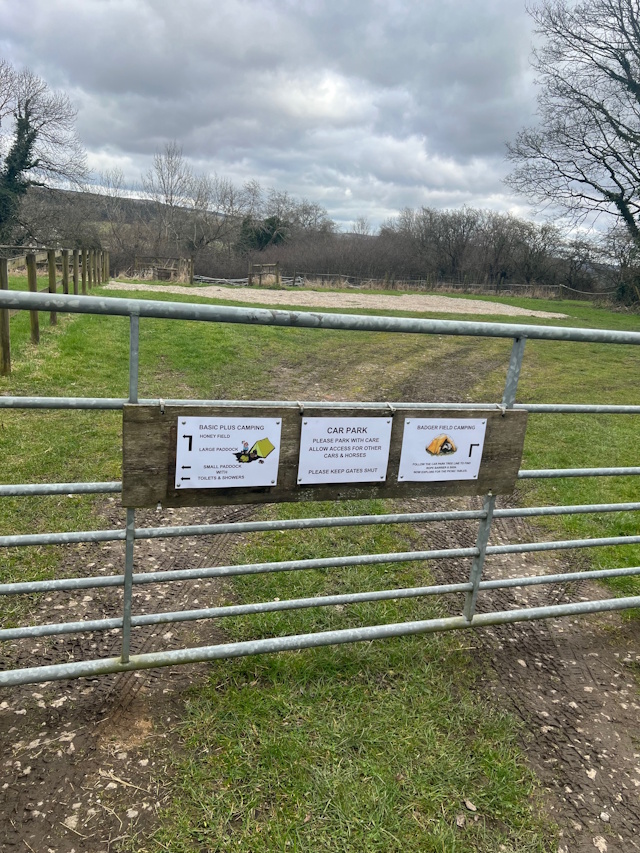 Our car park gate sign points you to the left for Basic Camping in the Small Paddock, Large Paddock & Honey Field. The more expensive Badger Field is to the right. Please do NOT confuse the two.